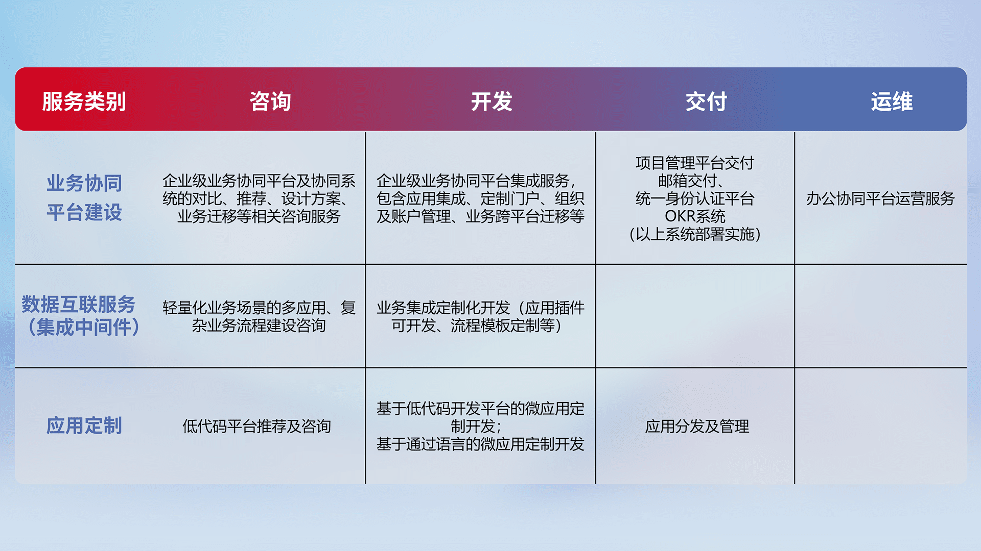 针对钉钉、、企微、、、、IDaas等平台级产品提供产品的规划、、方案、、交付、、、定制化开发等服务,,实现如统一协同办公、、、智能客户服务、、、混合会议管理、、、智能数据查询、、、等业务场景,,,实现数字化转型。。。
